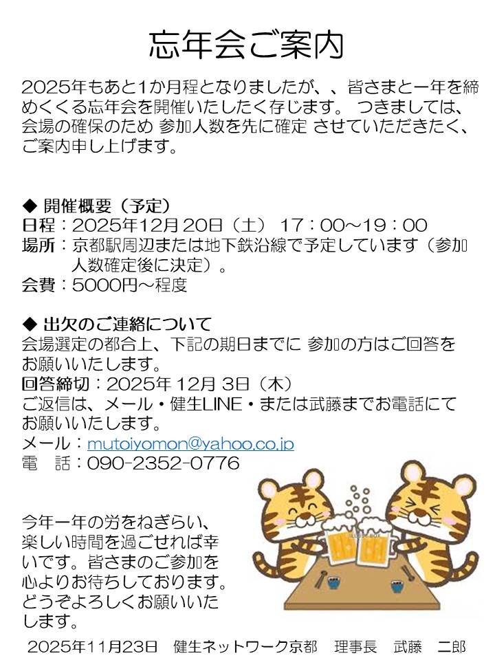 人数確定後に会場(京都駅周辺または地下鉄沿線予定)