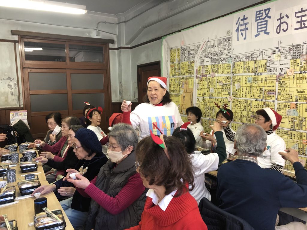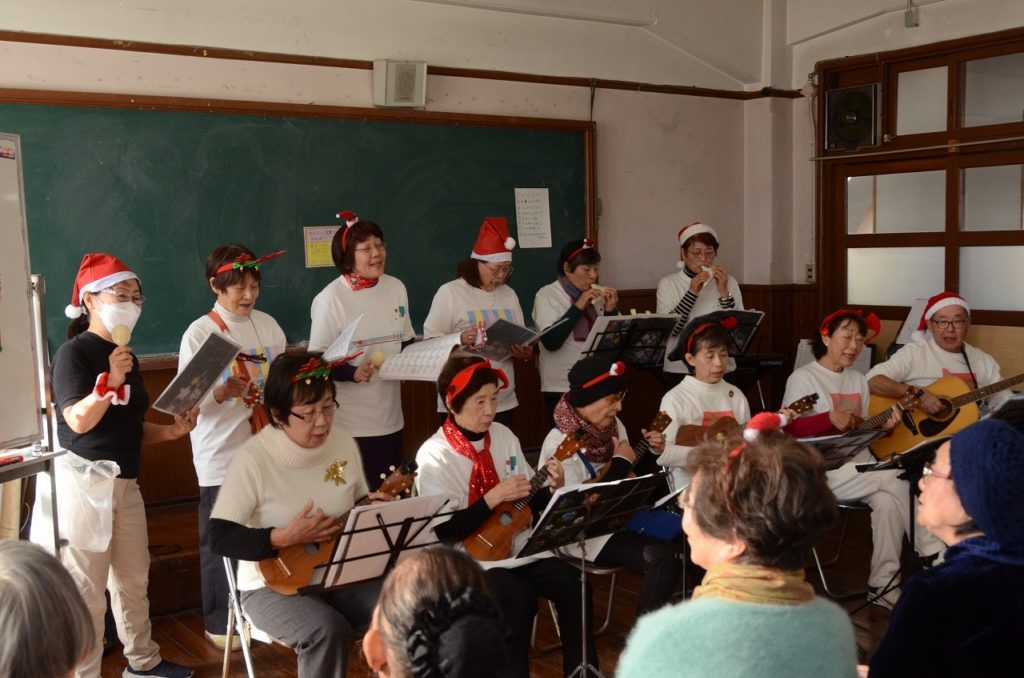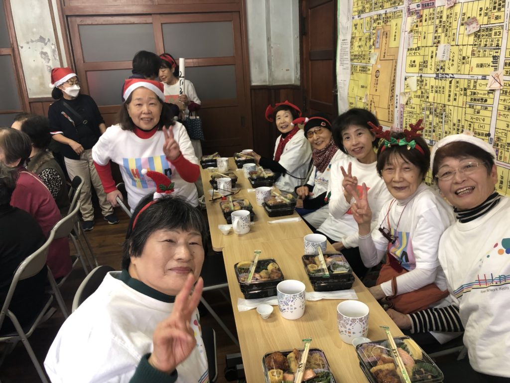 皮切りは12月13日上京区老人会「鶴友会」のXマスパーティに参加させていただきました。